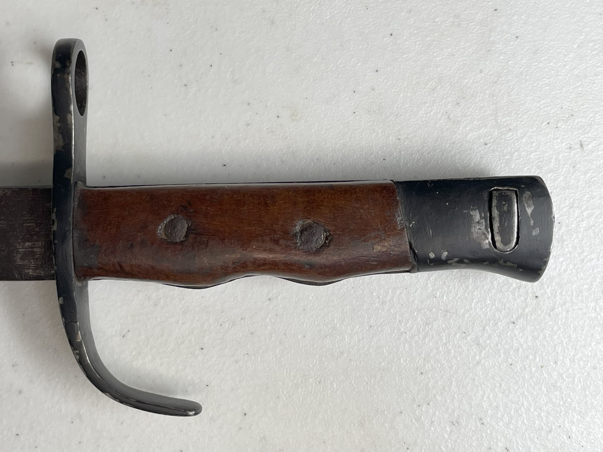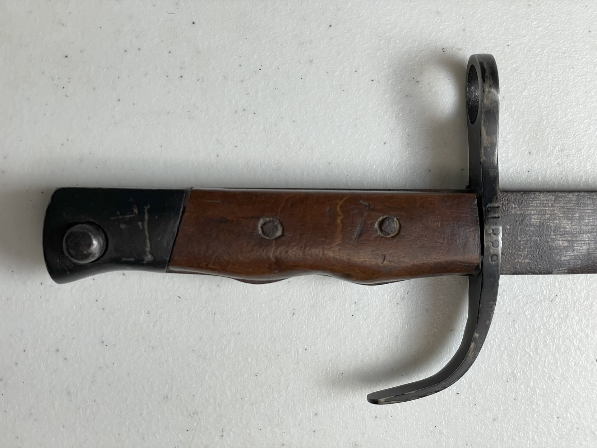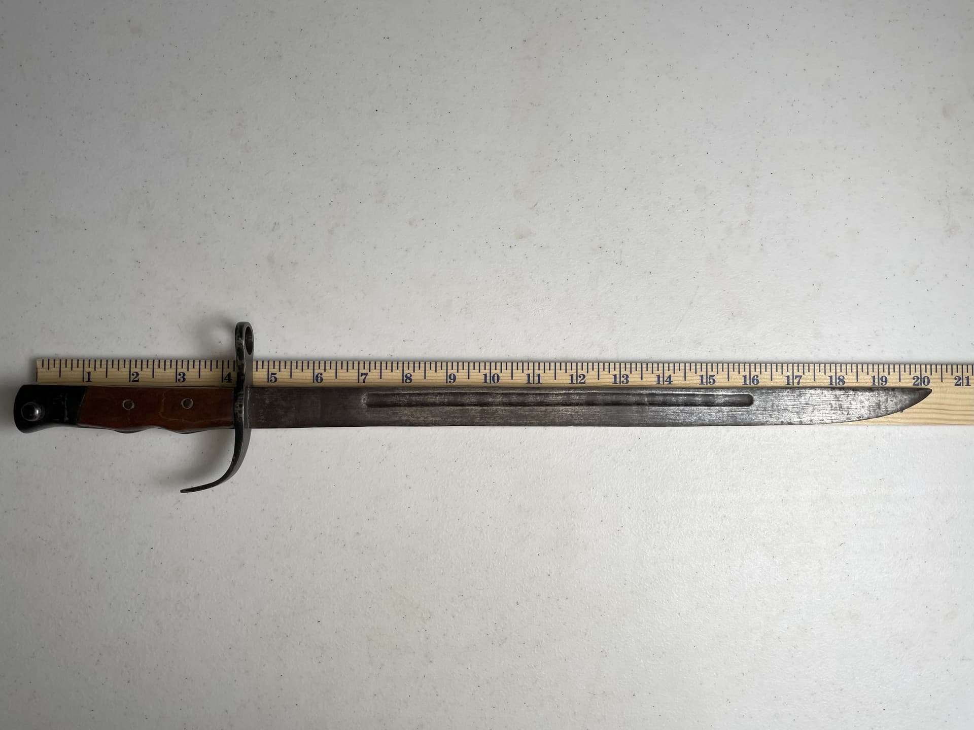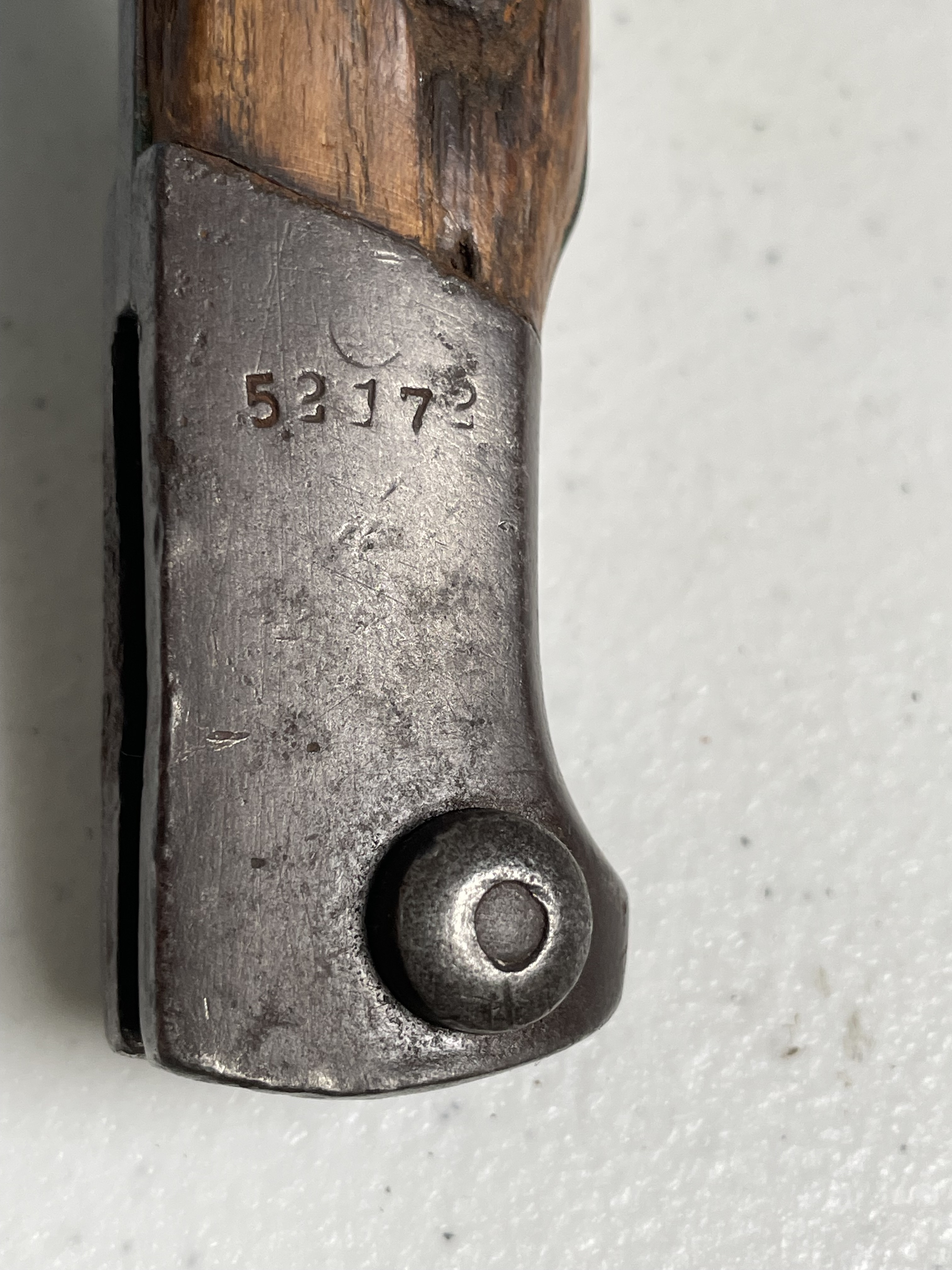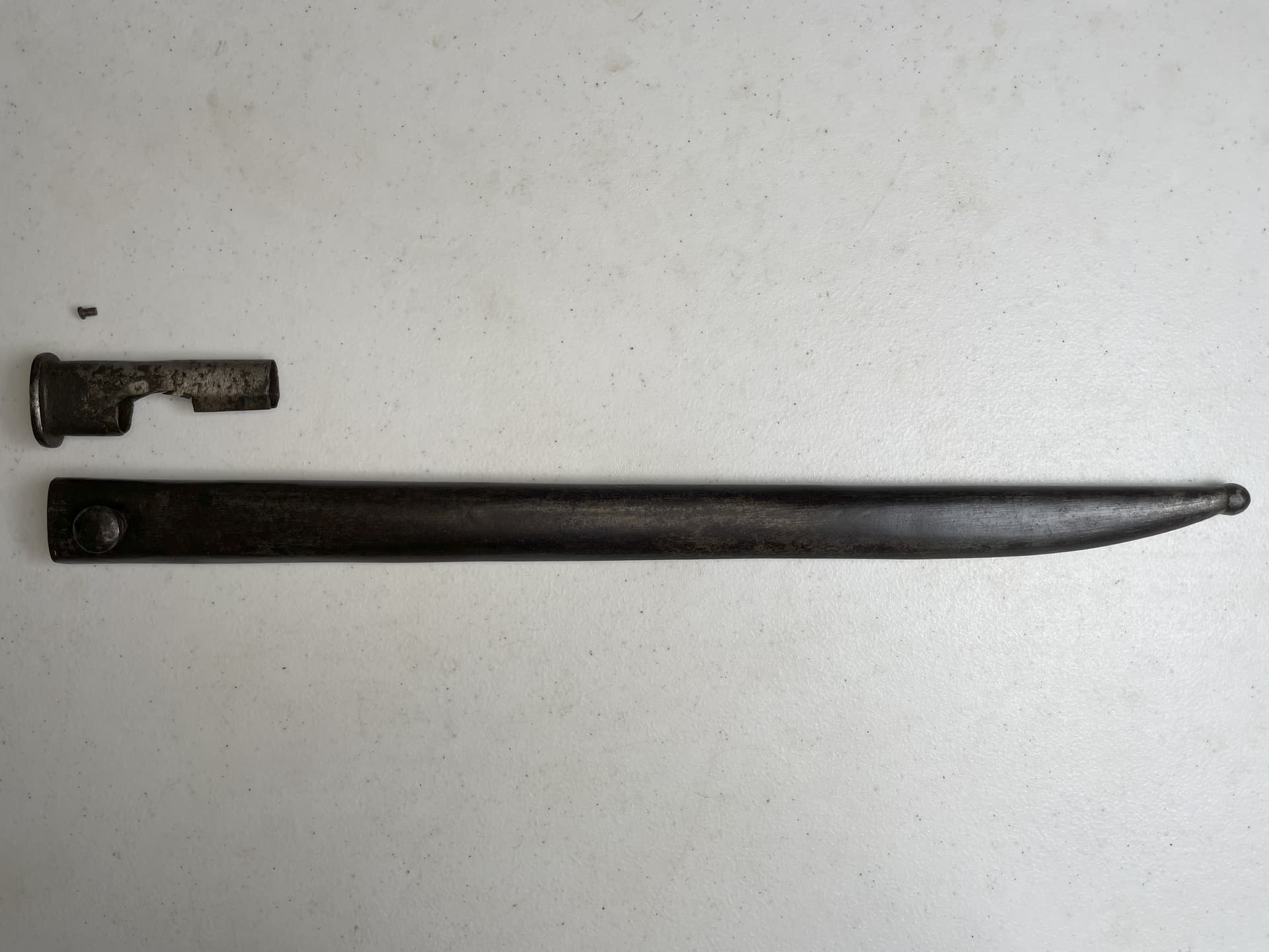 虽然中国产的汉阳88式步枪在美国市场并不罕见,但奇怪的是,汉阳步枪的刺刀却很难找到。自从2021年我入手第一支汉阳步枪以来,我就一直在寻找汉阳刺刀,无论是短的还是长的,但一直没有成功。经过四年漫长的寻找,终于梦想成真了!我最近在拍卖会上买到了一把长刺刀。根据以物辩史这本刺刀参考书,这把刺刀应该是山西造的。整体状况很好,但刀鞘口内部做工相当粗糙,但如果不取出来看,是看不出来的。护手的形状非常独特,这也是区分山西造的汉阳刺和其他兵工厂制造的汉阳刺的重要特征。上一厂(原汉阳兵工厂)和二十一厂(原金陵兵工厂)的汉式步枪没什么问题。但奇怪的是,上抗战胜利后山西自己造的汉式步枪却非常困难。以下是这把汉阳刺的照片,包括刀鞘、刀鞘口以及安装在二十一厂汉式步枪上的效果图。