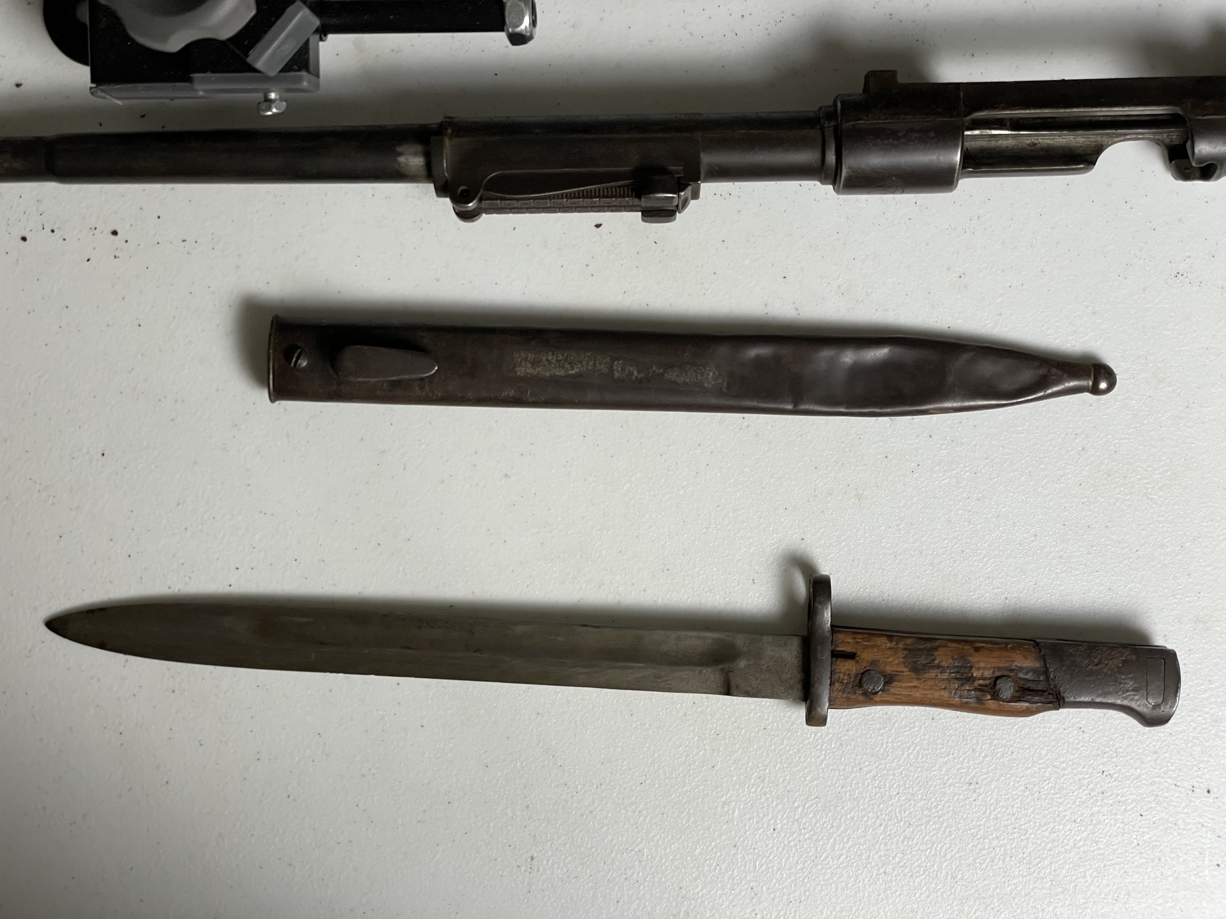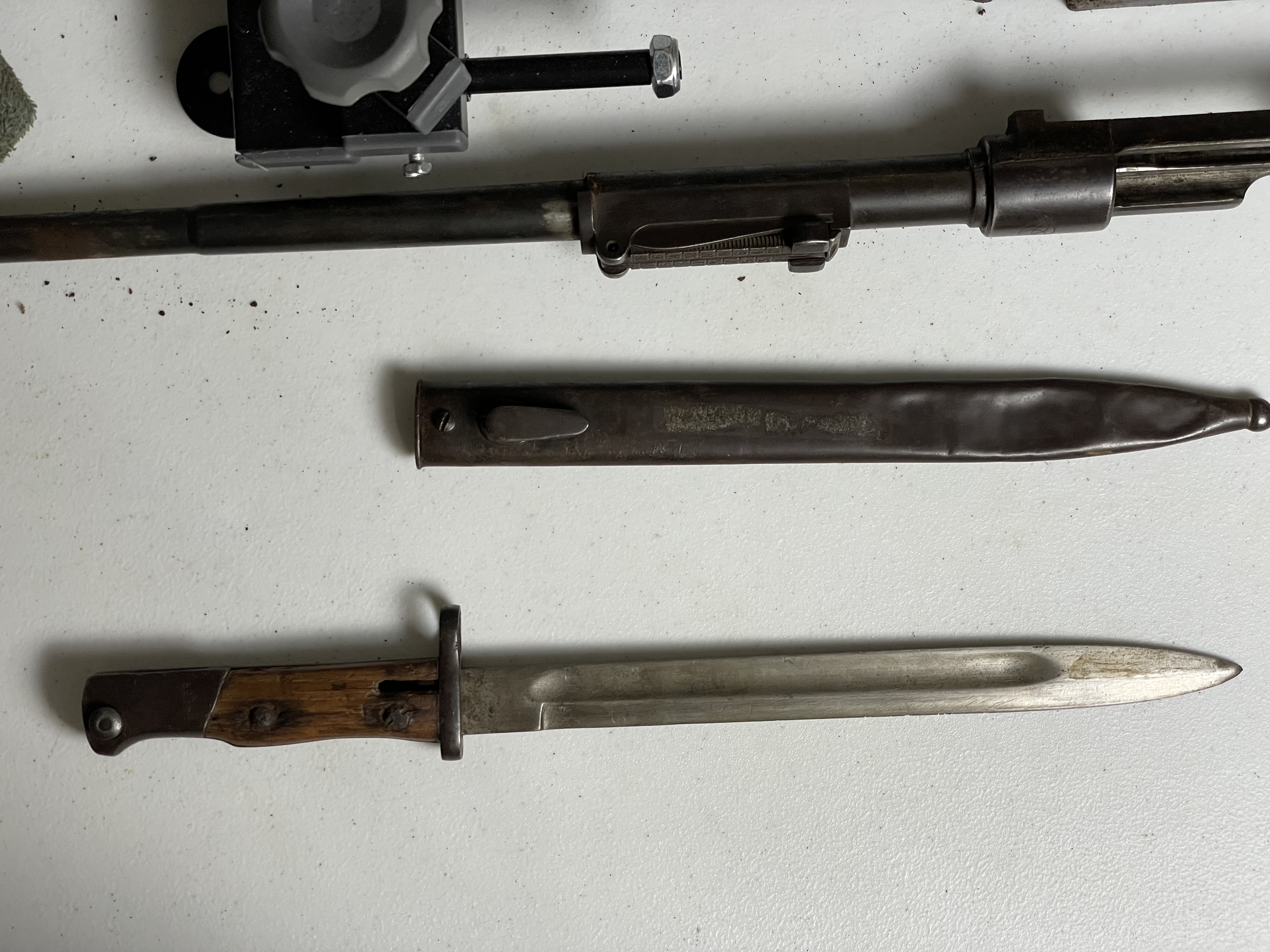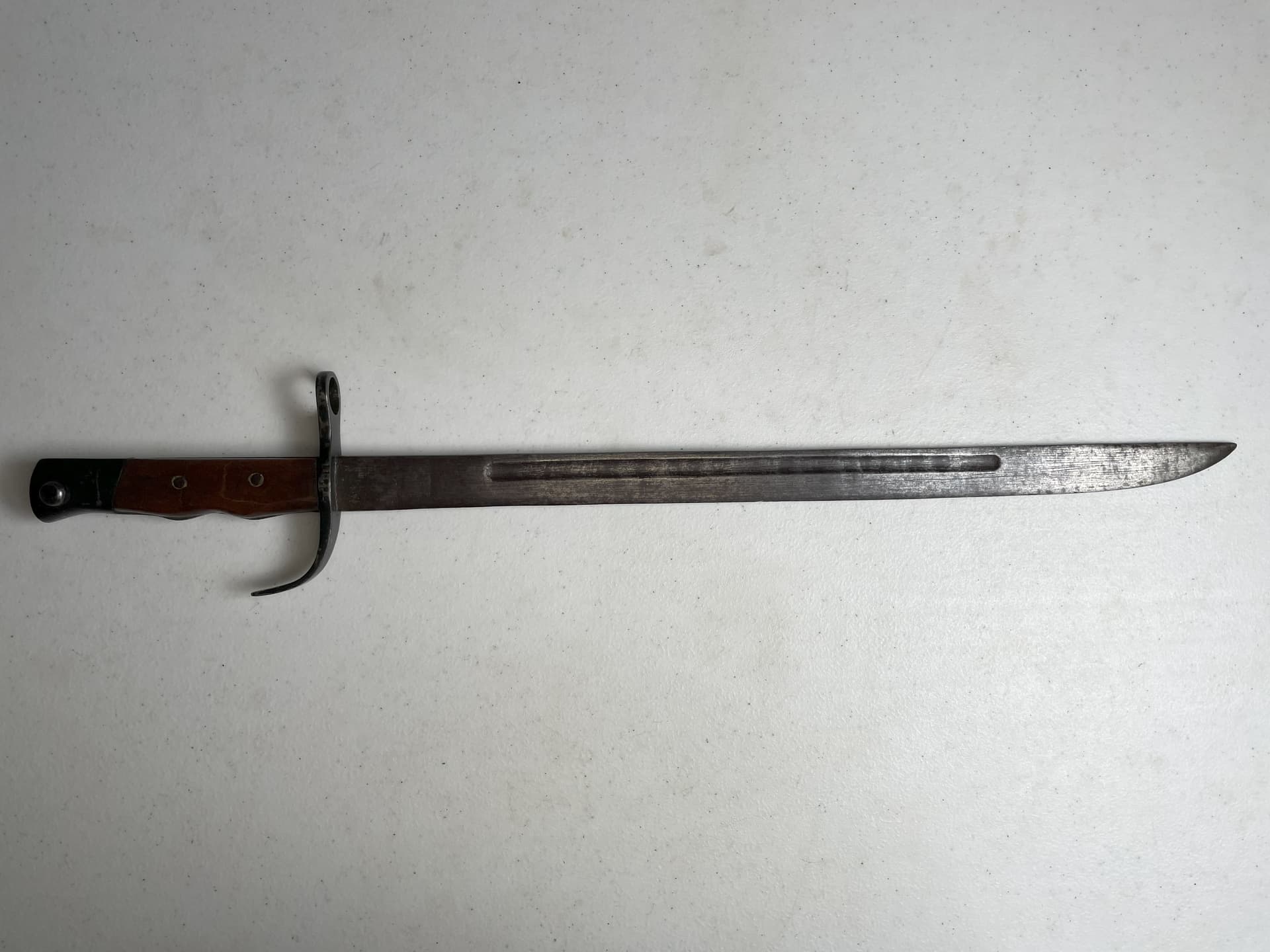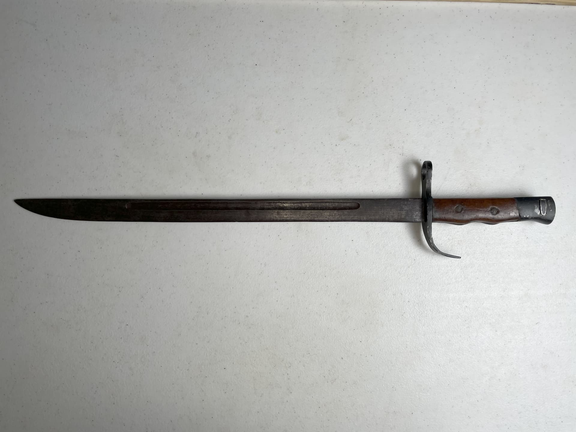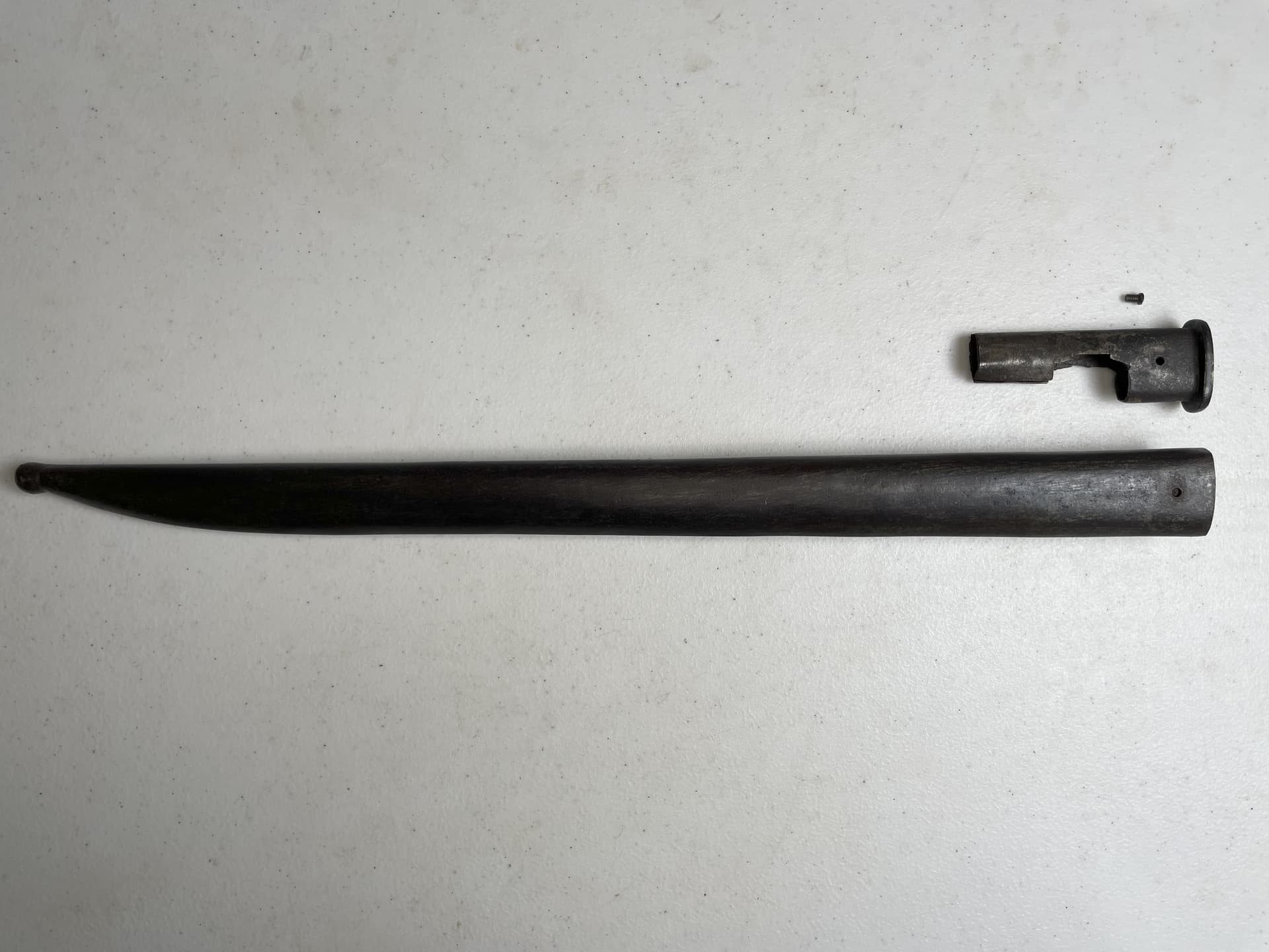 虽然中国产的汉阳88式步枪在美国市场并不罕见,但奇怪的是,汉阳步枪的刺刀却很难找到。自从2021年我入手第一支汉阳步枪以来,我就一直在寻找汉阳刺刀,无论是短的还是长的,但一直没有成功。经过四年漫长的寻找,终于梦想成真了!我最近在拍卖会上买到了一把长刺刀。根据以物辩史这本刺刀参考书,这把刺刀应该是山西造的。整体状况很好,但刀鞘口内部做工相当粗糙,但如果不取出来看,是看不出来的。护手的形状非常独特,这也是区分山西造的汉阳刺和其他兵工厂制造的汉阳刺的重要特征。上一厂(原汉阳兵工厂)和二十一厂(原金陵兵工厂)的汉式步枪没什么问题。但奇怪的是,上抗战胜利后山西自己造的汉式步枪却非常困难。以下是这把汉阳刺的照片,包括刀鞘、刀鞘口以及安装在二十一厂汉式步枪上的效果图。